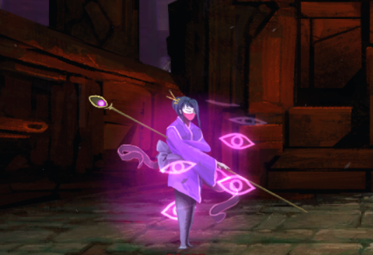 The Watcher’s character clearly suggests inspiration from East Asia. The Watcher wears a purple kimono-like clothing and obi with gray bottoms. Adorned on the Watcher’s hair bun is a pair of golden chopsticks. And in the Watcher’s hands is a long golden staff topped with a design reminiscent of an eye. Even beyond character design however, the Watcher’s abilities also seem inspired by martial arts and spiritualism.